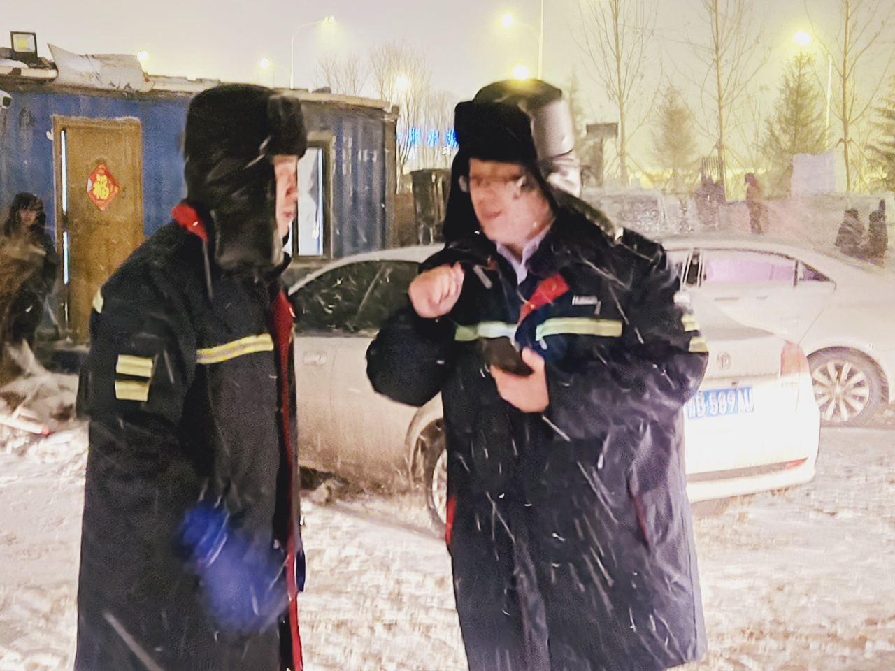 虽然寒风刺骨,北风呼啸,大家在大雪纷飞的现场干得却是如火如荼,一片热火朝天的大干景象。大吊车正在不停地吊拉着大袋的融雪剂,二十多名干部职工在现场不停地搬运、拆袋、投料。尽管大家戴着棉帽子穿着厚厚的工作服,但几个小时下来,手脚已经完全失去知觉,尤其配制融雪剂的现场是高空作业,夜幕降临后气温更是降至零下12度,很快全身冻透了。为了不让体力透支且能迅速将融雪剂发放到位,企业领导要求大家兵分两组,两人一组分两班四十分钟一轮换,这样可以缓冲体力,更好地保持工作实效性。