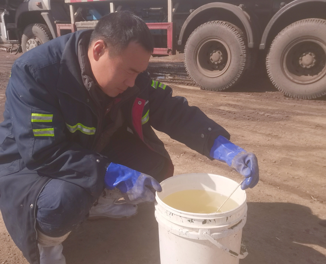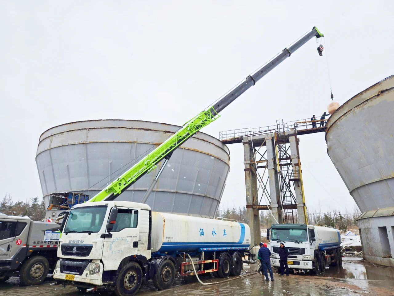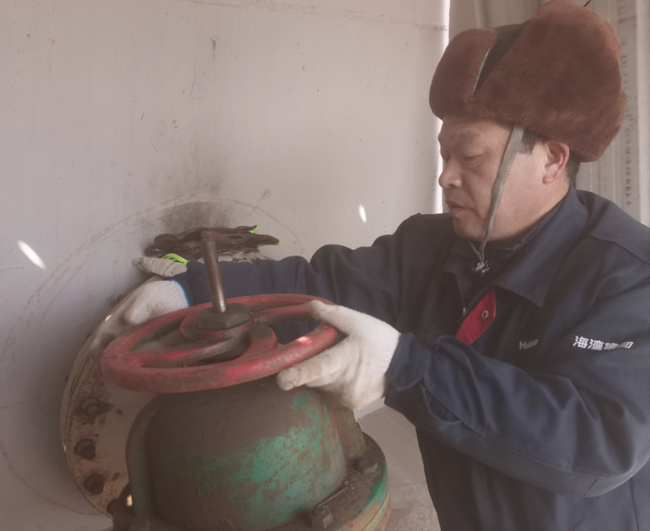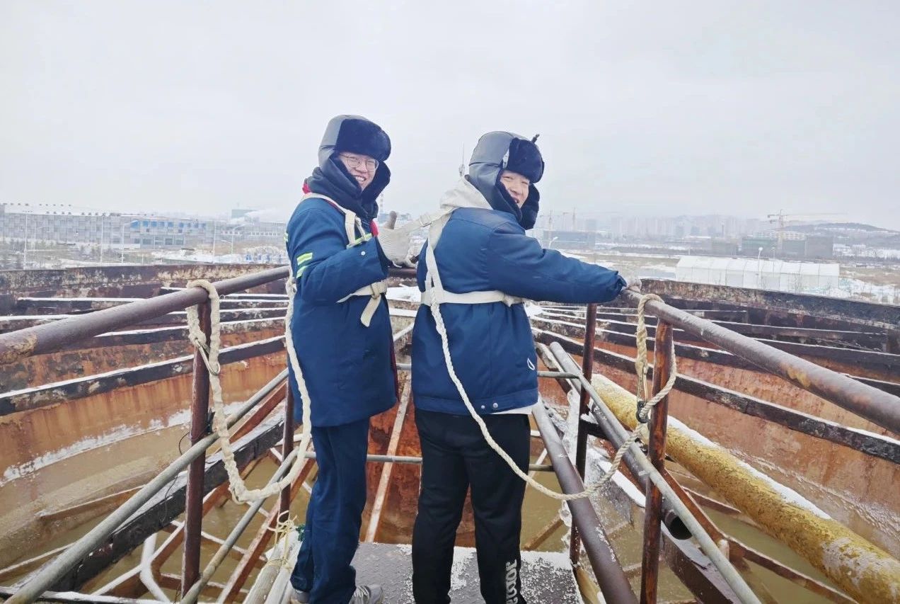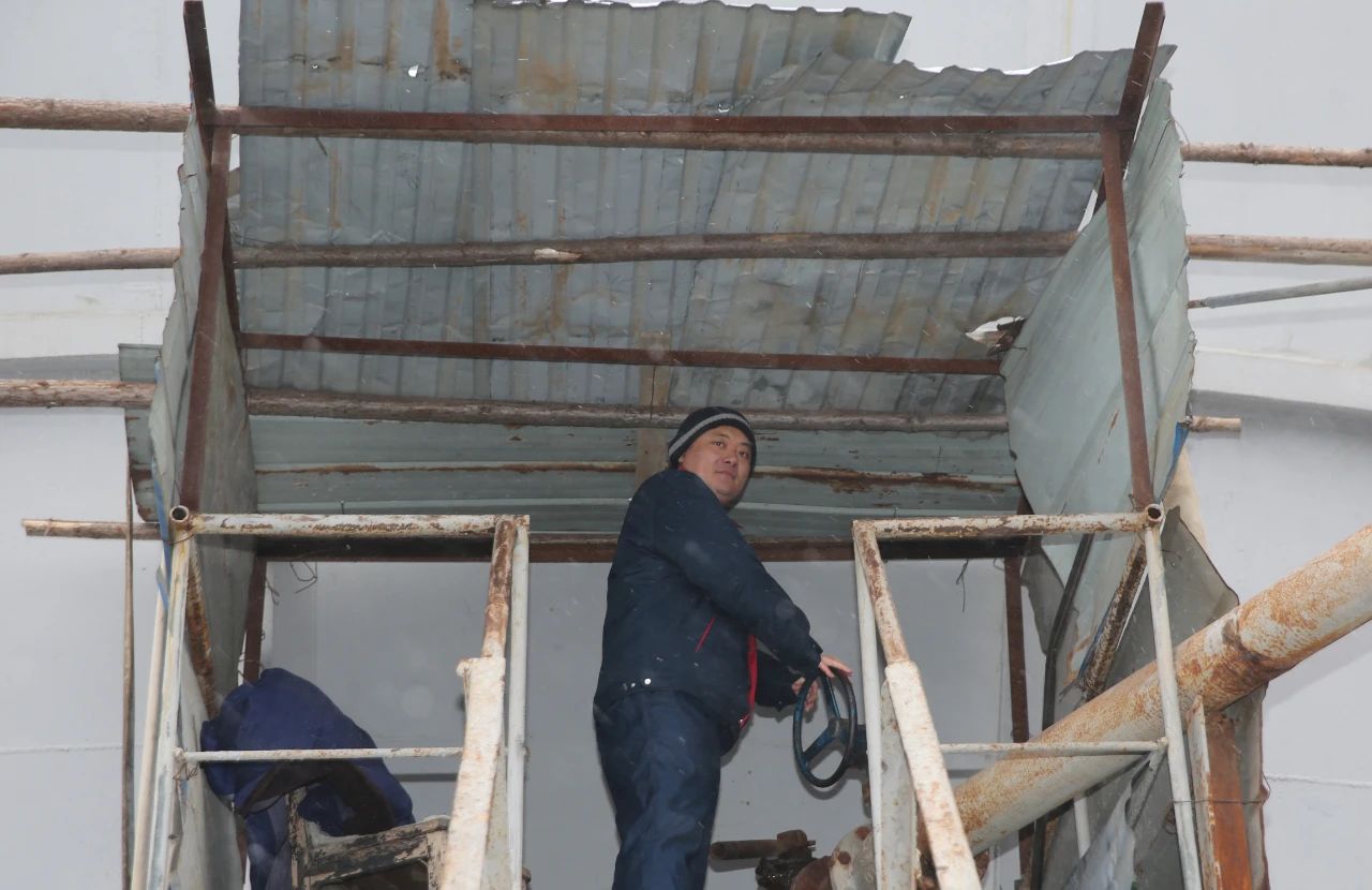 为了确保融雪剂的及时供应,员工们在各自工作岗位上,顶风冒雪全力以赴地奋战着,大家分工协作,工作忙而不乱井然有序。记者在现场看到,一组人员爬到罐顶进行液位测量,计算罐内融雪剂存量;另一组人员检查各个泵、水管、开关是否处于正常工作状态。经济运行部张斌师傅已年近六十,但他积极发挥党员模范带头作用,克服低温、大风等恶劣天气,在现场有序地指挥着开阀、关阀、倒车的同时,还在不时地嘱咐大家,高空作业一定要注意安全。