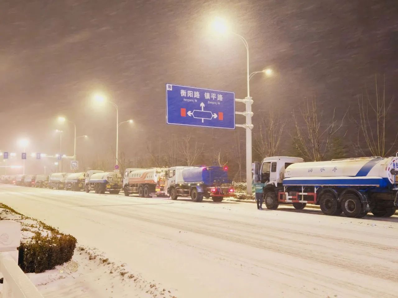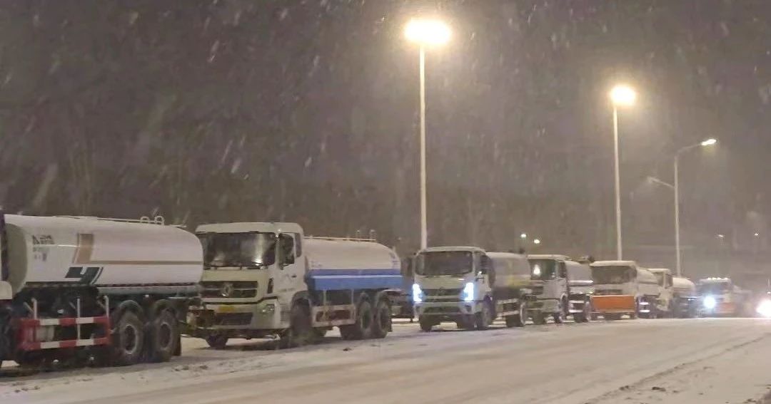 2月21日凌晨,此时大家已经连续工作了50多个小时,但融雪剂发放现场来自全市四面八方的洒水车排起的长龙一眼望不到边,员工们依然不畏严寒任劳任怨坚守阵地,心里想着快一点再快一点,让更多的车辆早一点把融雪剂抛洒出去,解决市民出行的困难。