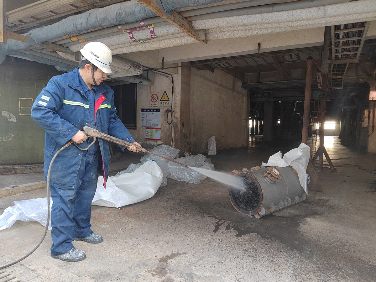 随着第一段吸收塔吊装至一楼,“大战”一触即发,大家立即将塔器内的石墨填料取出,先用铁签将填料和塔内较为松动的积料清出,再用循环水认真清理附着在上面的顽固积料。高压水枪遇上顽固积料水花四溅,班组成员们却丝毫不受影响,认真地将所有吸收塔断清理、冲刷干净,等待回装填料。